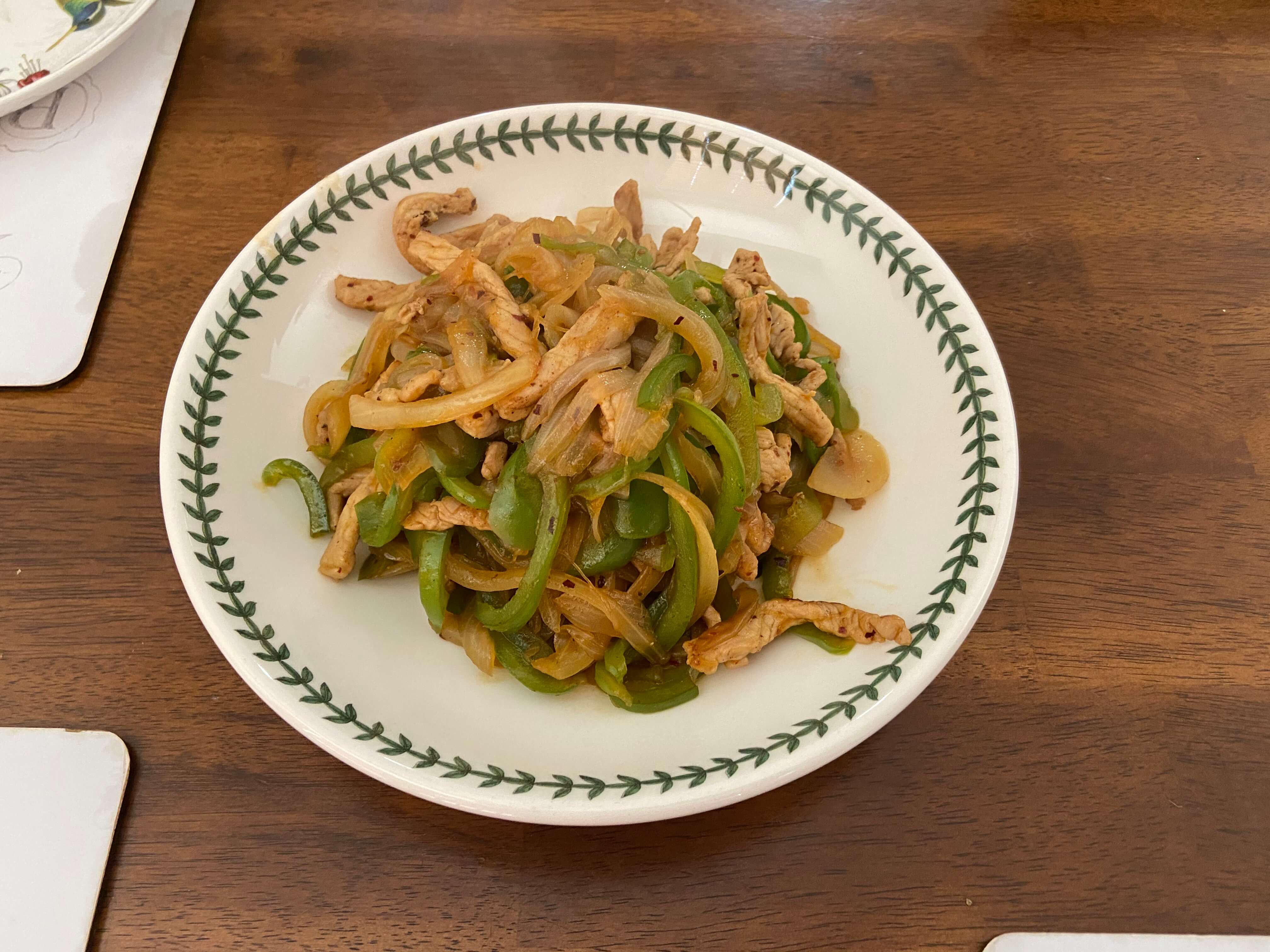 고추 잡채는 간단히 돼지고기, 양파, 벨 페퍼에 굴 소스만 넣어주면 끝입니다.