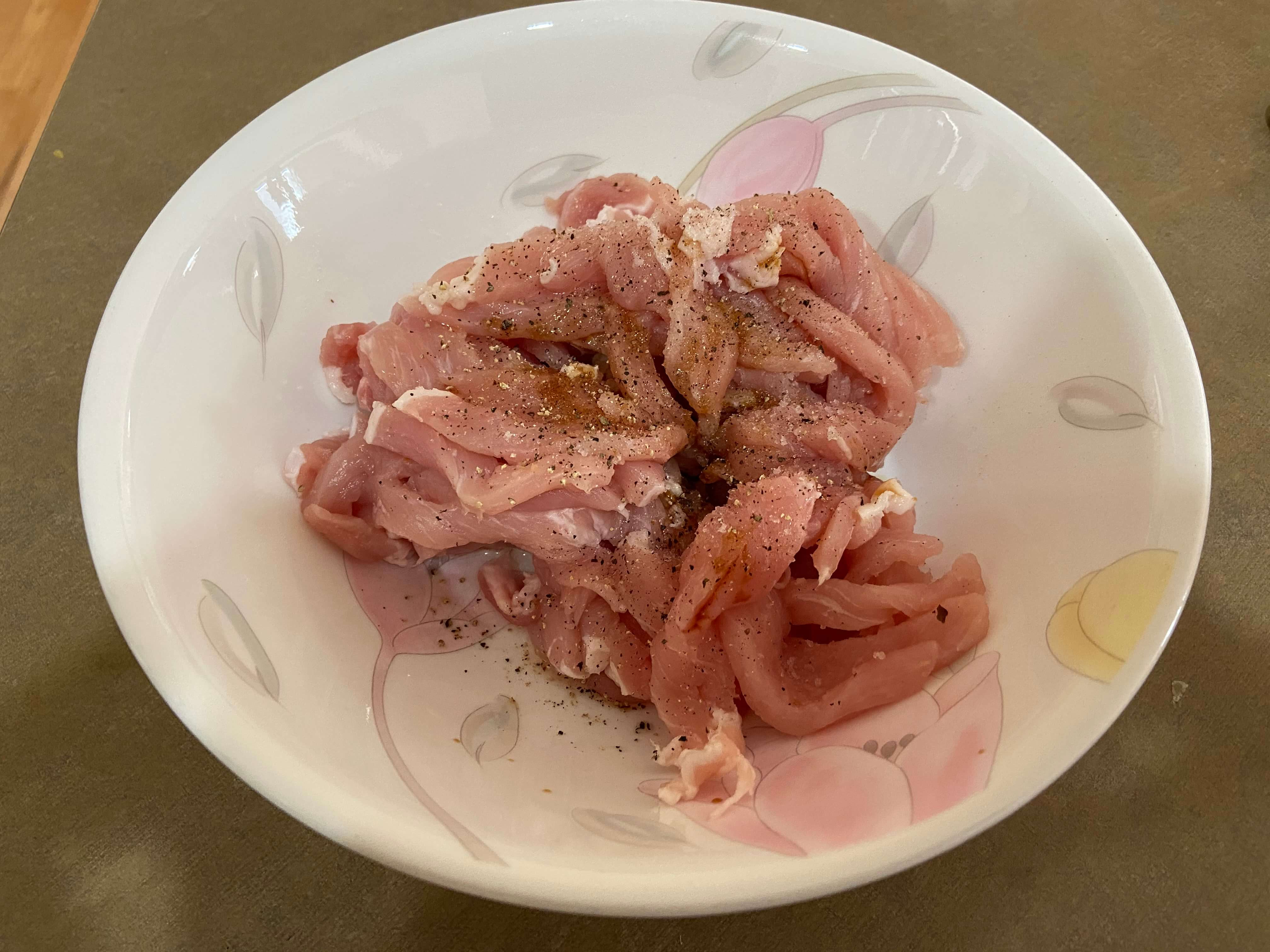 돼지고기는 가능한 얇게 썰어 용기에 담아서 소금, 간장, 맛술, 후추를 넣은 뒤 잘 섞어 줍니다.